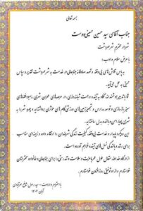 • شهروند گرانقدر با حضور در شهرداری، از زحمات شبانه‌روزی سیدحسین حسینی دوست شهردار مهردشت تقدیر کرد و با اهدای لوحی ارزشمند، قدردانی خود را از تلاش‌های بی‌وقفه مدیریت شهری ابراز نمود.