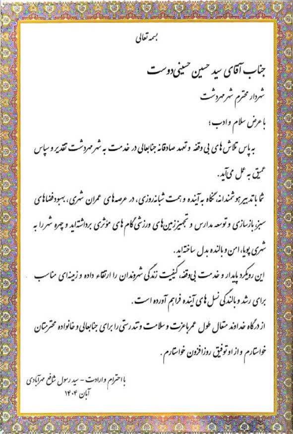 شهروند گرانقدر با حضور در شهرداری، از زحمات شبانه‌روزی سیدحسین حسینی دوست شهردار مهردشت تقدیر کرد و با اهدای لوحی ارزشمند، قدردانی خود را از تلاش‌های بی‌وقفه مدیریت شهری ابراز نمود. این حرکت صمیمانه، نمادی از همراهی مردم با مسیر توسعه و آبادانی شهر است.